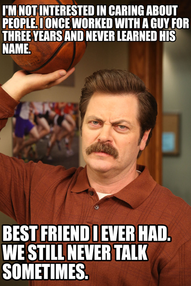 Ron swanson work memes. 18 of the best ron swanson quotes. Reconsider your life ron swanson barbecues should be about one thing. Easily add text to images or memes. Ron swanson describing his sexual history epic. Nobody s been able to make being a misanthropic breakfast lover look so damn good. In fact ron swanson despises hippies which are just one of his several pet peeves in this world. Ron worked both artisan jobs for a short time all while completing ron swanson memes read more.